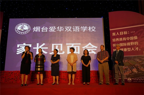 郭美娟校长率高中部李雪梅校长、小学初中部李萍校长、幼儿部张连萍园长、高中部陈云珠老师,以及烟台华圣国际教育发展有限公司陆淳范总经理、烟台华圣国际学校Andy老师登台与学生和家长见面