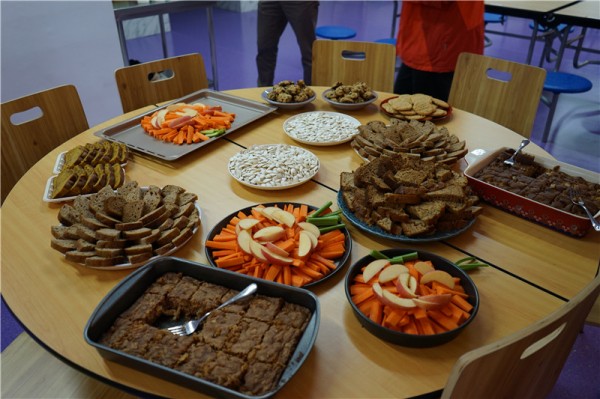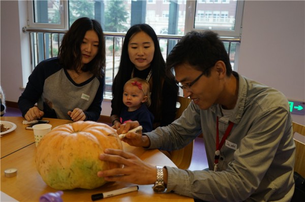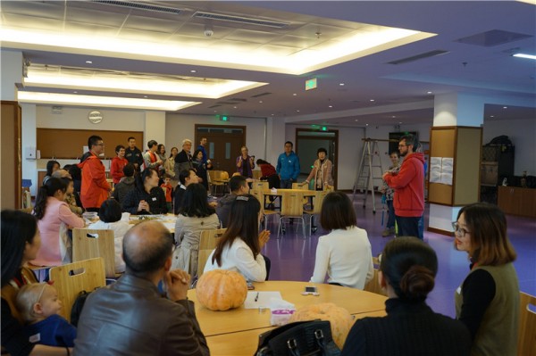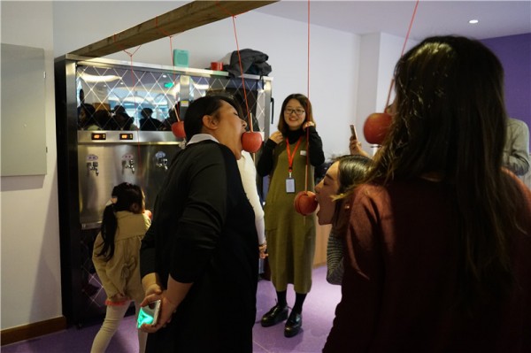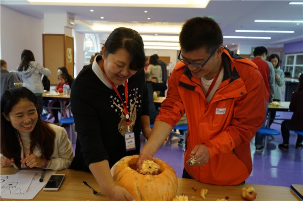 本次万圣节Party在华圣国际学校餐厅举行,华圣国际学校为老师们准备了丰盛可口的美食,Party活动前,每位参与的老师都在胸前贴上了写有自己英文名字的标签,Party活动中,大家一起玩起了吃苹果比赛、橙子画画等小游戏,还分团队亲手制作起了万圣节的标志物——南瓜灯,Party活动气氛欢快,笑声弥漫了整个会场。