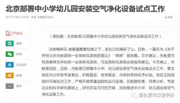 文中建议,北京市教委可利用寒假为学校统一安装新风系统。在教育投入比重很高的北京,新风系统才刚刚进入试点,而在爱华,新风系统从学校建成的那一天起就在24小时运转着。