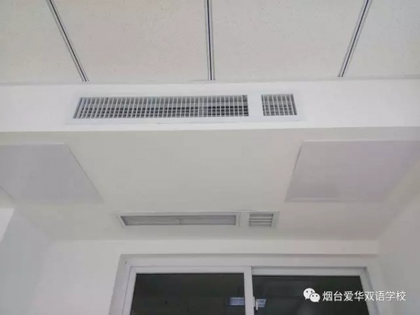 在爱华学校设计、建设之初,室内的空气质量问题就被充分考虑到了,学校教学楼内的取暖、制冷采用中央空调并配备新风系统,新风系统全天24小时开启,保证教室内的空气每2小时更新一次。