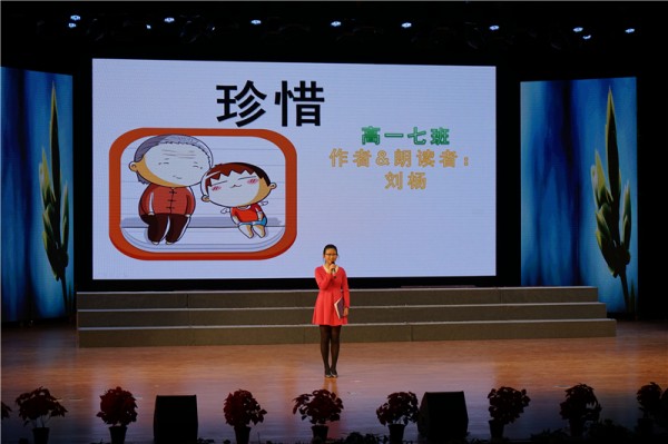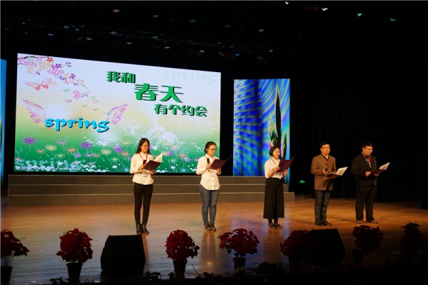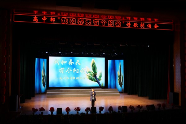 朗诵会一开场,高中部语文老师首先亮相,吟诵诗歌《我和春天有个约会》,赢得学生满堂彩!