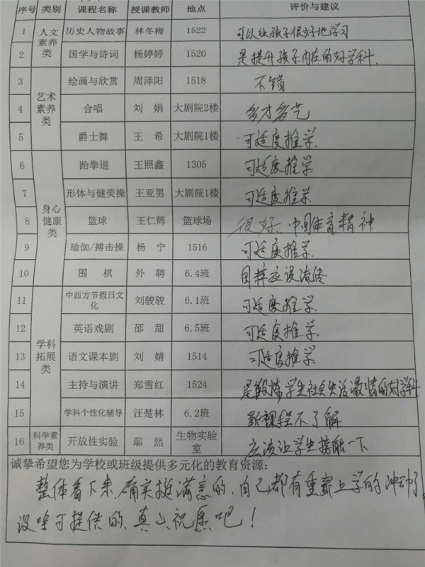 认真填写《校本选修课程信息反馈表》的家长朋友