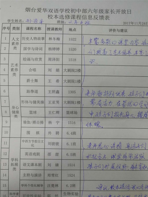 烟台爱华双语学校初一级部于2017年11月24日(周五)下午举办了以“走进课堂,体验成长”为主题的家长开放日活动。开放两节课,第一节观摩校本选修课程;第二节走进课堂,共同体验、学习学科课程。