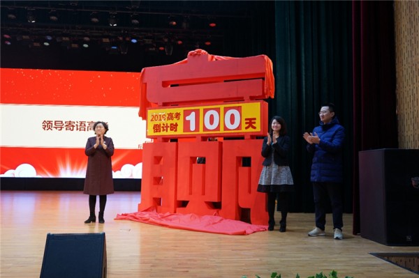 大会上,郭美娟总校长、赵乔瑜董事长和孟令刚总经理共同揭开高考倒计时牌。
