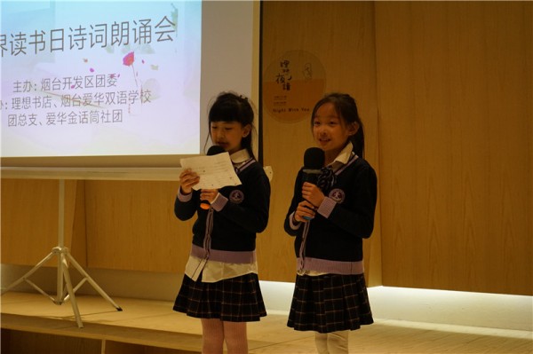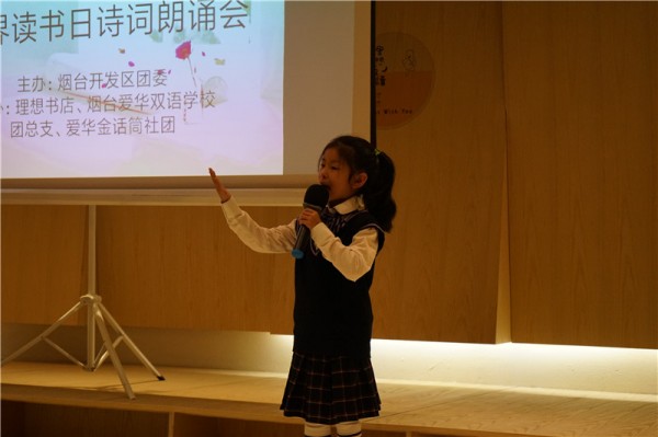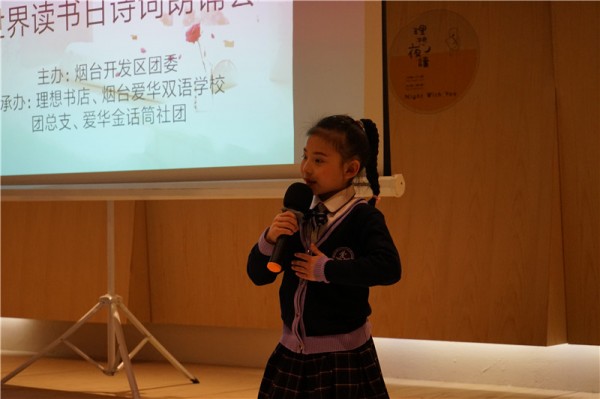 4月23日是“世界读书日”,但对于每一位爱华学子来说,天天都是读书日。烟台爱华双语学校倡导孩子们多读书、读好书,增加知识储备、提高自身修养。4月20日,由烟台开发区团委主办,烟台爱华双语学校团总支、爱华金话筒社团和理想书店共同承办的诗词朗诵会成功举行,40多位爱华小小朗诵家们用深情朗诵声迎接“世界读书日”。