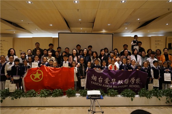 烟台开发区工委宣传群团部文化出版处修帅处长、烟台开发区团委陈昉书记共同为爱华小小朗诵家们颁奖